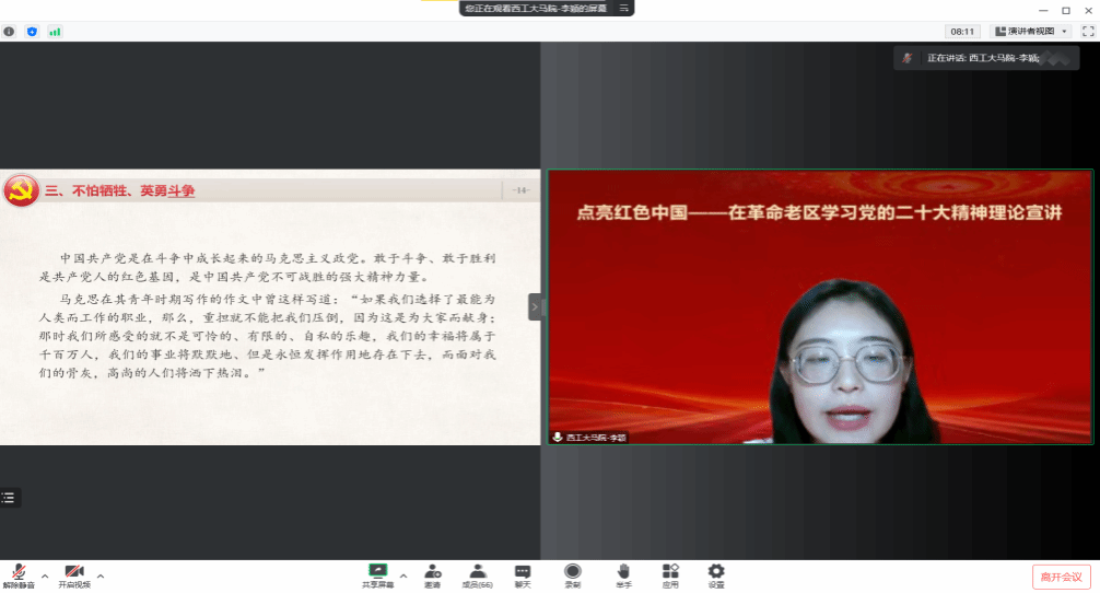 王换老师指导的20余名硕士研究生组成的“点亮红色中国”党的二十大精神进基层·青春逐梦行实践队,面向宁夏革命老区团员青年开展党的二十大精神宣讲。本次宣讲由张肖丽同学主持,受众包括来自宁夏盐池县西部计划志愿者、盐池县“809000”青年宣讲团成员、盐池县第三中学学生等近500名同学。