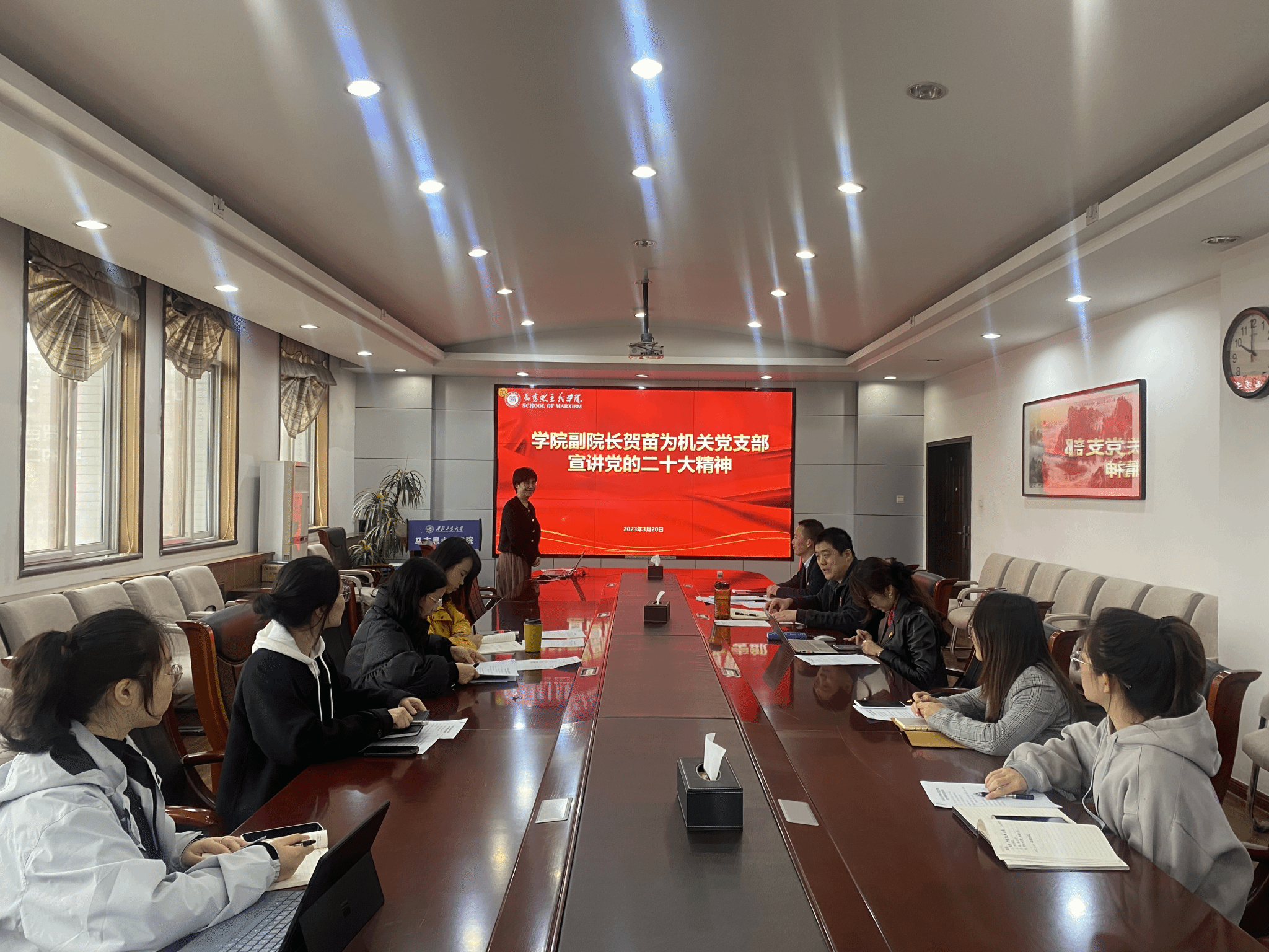 贺苗以《深入学习领会党的二十大精神》为题,从深入学习领会党的二十大的重大意义、深入学习领会党的二十大的主题、深入学习领会过去五年的工作和新时代十年伟大变革、深入学习领会习近平新时代中国特色社会主义思想的世界观和方法论、深入学习领会中国式现代化、深入学习领会党的二十大对未来五年党和国家各项事业发展的战略部署、深入学习领会以党的伟大自我革命引领伟大社会革命的重要要求、深入学习领会发扬斗争精神、增强斗争本领、坚持团结奋斗的时代要求八个方面,结合学院院办工作特点及具体工作实际进行了深入分析讲解。