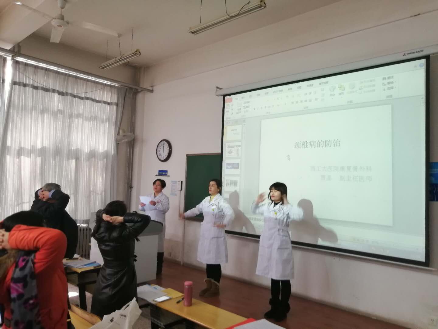 校医院外科副主任医师贾晶等大夫作了健康知识讲座,带领大家做了颈椎保健操。
