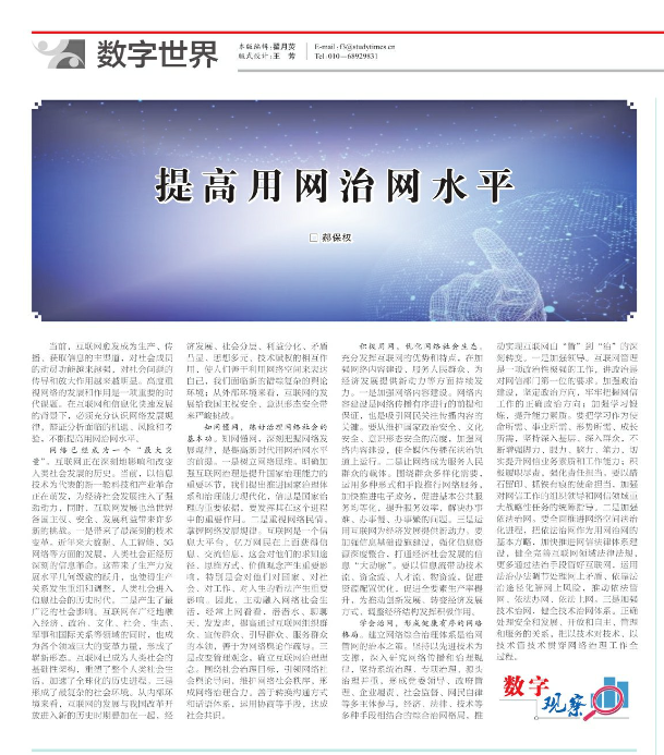 教授在中央内参《学习时报》发文:从四个方面提高用网治网水平。《学习时报》1999年9月创刊,中共中央党校主办,面向全国,服务全党,以各级党政干部和广大知识分子为主要对象,是国内外公开发行的全党唯一专门讲学习的报纸。