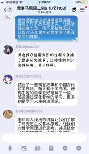 老师还从传统文化蕴含的人生哲理和民族精神角度出发,引导学生正确的世界观、人生观和价值观的形成。在师生互动中,同学们理解了马原课的专业知识,也扩宽了知识视野,提升个人修养内涵和道德素质,形成了乐观的生活心态,一节课在不知不觉中就结束了。这些只是黄琳老师的课堂一角,德国古典哲学中的康德、费希特、黑格尔,古希腊哲学中的赫拉克利特、巴门尼德和柏拉图、亚里士多德,先秦诸子中的老子、庄子、孔子、孟子、朱熹、王阳明、王夫之、《周易》……这些中西方古代哲学思想在她的课上随处可见。不仅深入浅出地讲清楚唯心主义、唯物主义的区分,而且建基于不同的形而上学哲学形态,深刻揭示古今中外辩证法的发展渊源。