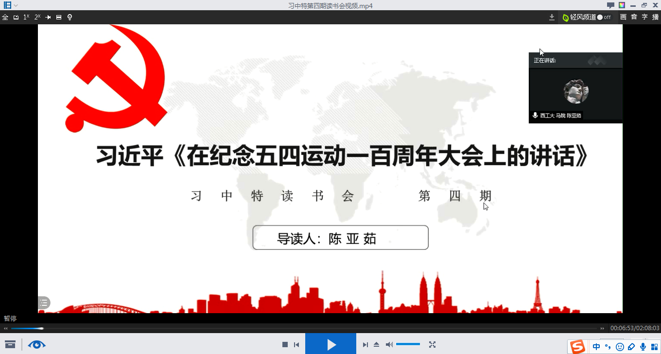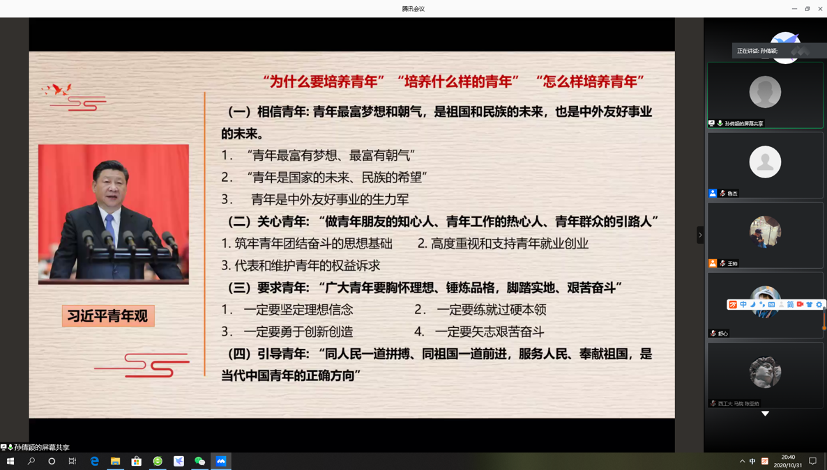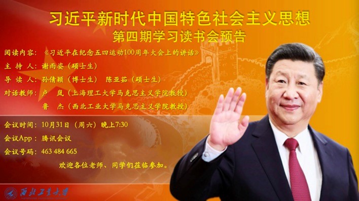 于2020年10月31日晚7:30举办了习近平新时代中国特色社会主义思想学习读书会第四期交流活动,本次读书会主题主要围绕《习近平在纪念五四运动100周年大会上的讲话》进行展开。此次活动由91大神