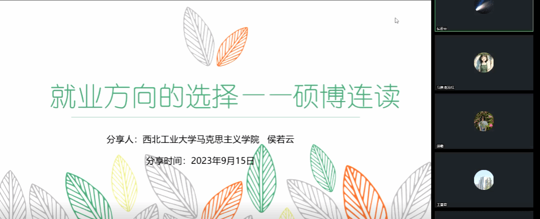 第一位分享的是思想政治教育专业选择硕博连读的侯若云学姐。学姐从联系导师、博士攻读计划书、报名材料以及面试四个方面谈到了硕博连读所需要做到的准备:一是提前规划,态度诚恳联系博士导师;二是做好硕博连读时间安排、准备专家推荐信、明确自身研究方向学科属性以便更好完善博士攻读计划书;三是将报名材料提前准备、勿错过网报时间;四是对于申博的面试内容,包括自我介绍、马原理原著相关的英文基础问答、PPT博士攻读计划以及导师质询环节。最后,侯若云学姐讲到,无论是读博亦或是工作,都要静下心去学习,付诸行动。