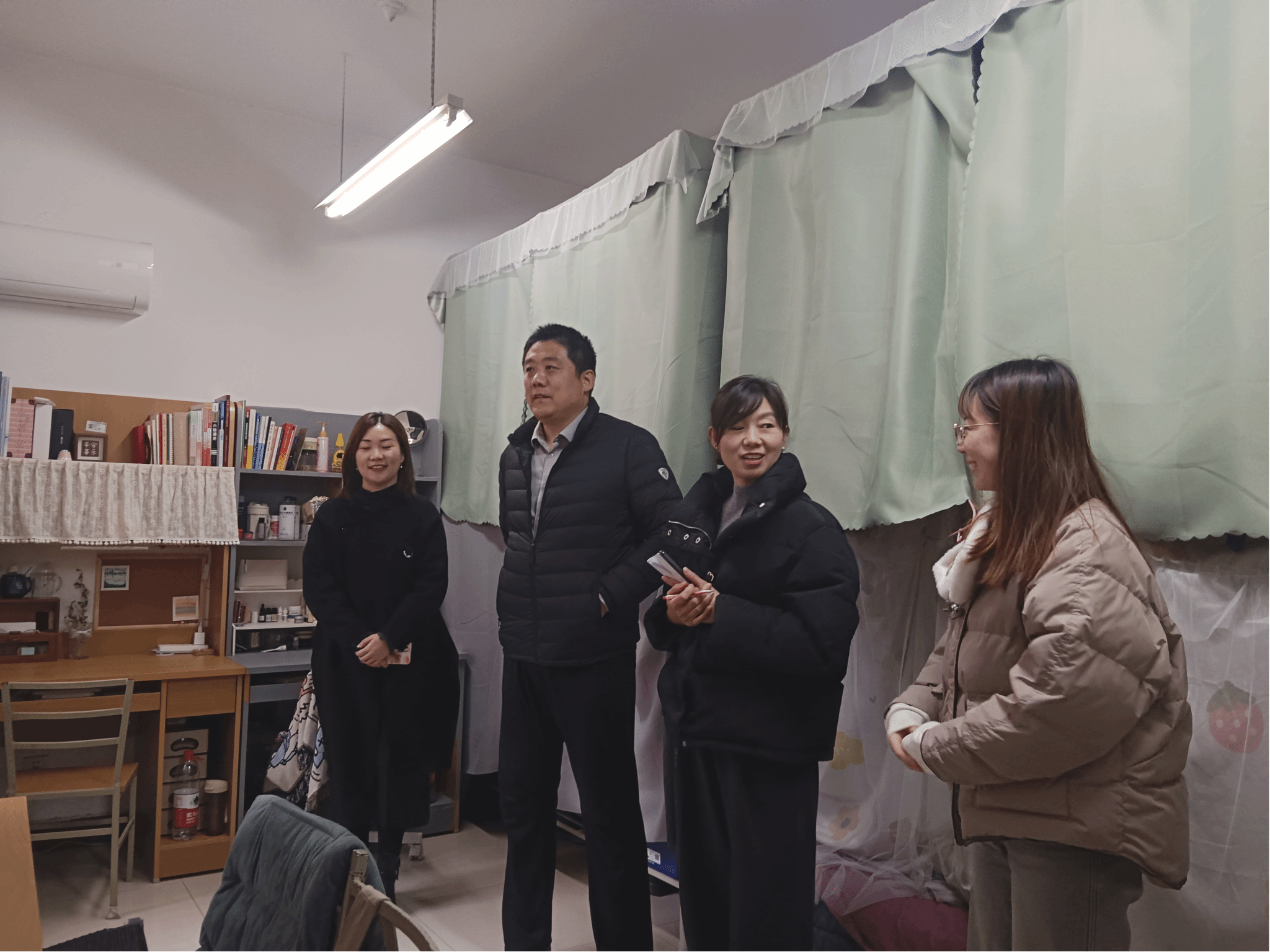 党委副书记李刚与博士生辅导员许斯诺、硕士生辅导员王换、学生兼职辅导员王夏荷一同走访学院学生自习室与各年级学生宿舍。