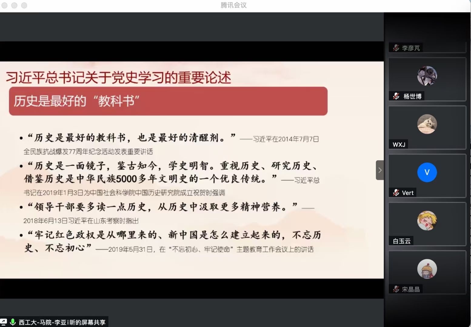思想政治教育系主任鲁杰教授与多位硕博生共同参加,以《习近平在党史学习教育动员大会上的讲话》作为本次读书会的主要学习内容,在本次读书会上大家展开了学习交流与讨论。