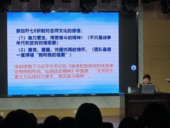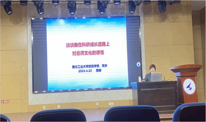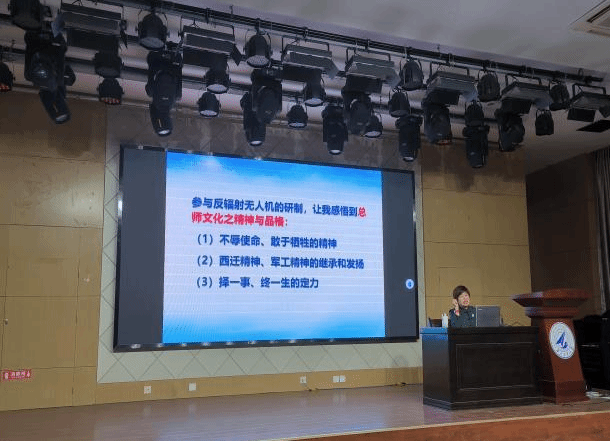 周洲老师以拼搏创新为核心,通过四个亲身经历的科研故事,声情并茂地分享了自己对“总师育人文化”的独到见解。首先,她回溯了自己在求学期间参与的科研项目,以导师的典范为例,强调要有自力更生、艰苦奋斗的精神,爱党爱国、忧国忧民的情怀。其次,周老师分享了自己参与国内第一个反辐射无人机研制的故事,强调要有不辱使命、敢于牺牲的精神,择一事、终一生的定力。接着,周老师分享了自己在主持国内第一个高空长航隐身无人机项目时的故事,并强调要看准方向、敢于创新、无问西东。最后,周老师谈到了自己在主持国内第一个“太阳能-WiFi无人机”项目时的故事,以生动的事例向同学们诠释“幸福是奋斗出来的”这一深刻道理。