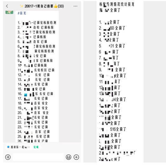高度重视疫情防控工作,及时摸排全体学生的情况,通过辅导员和班长的反馈,及时上报核酸检测情况,同学们积极在群内汇报自己的情况,为疫情防控工作开展筑牢基础。