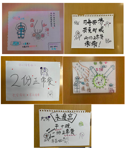 在封闭期间负责长安校区云天苑D座,保证学生用餐。接到任务后,学院迅速成立工作小组,学生干部驻扎云天苑D座,开展相关工作,在同学们的配合下,各楼层组织志愿者,建立联系群,保证送餐工作有序开展。