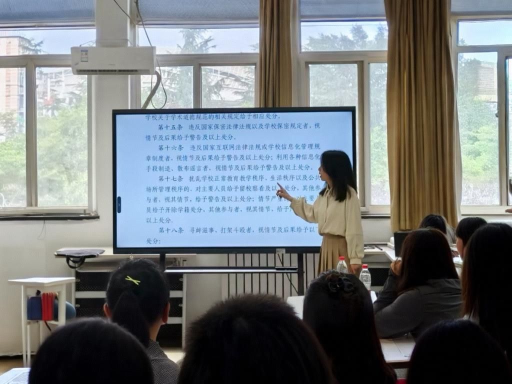 学生违纪处分管理办法》等文件,立足学校规章管理制度为新生讲解研究生日常管理规定和违纪处分实施细则。最后,25218-01班和25218-02班分班讨论了班级事务。