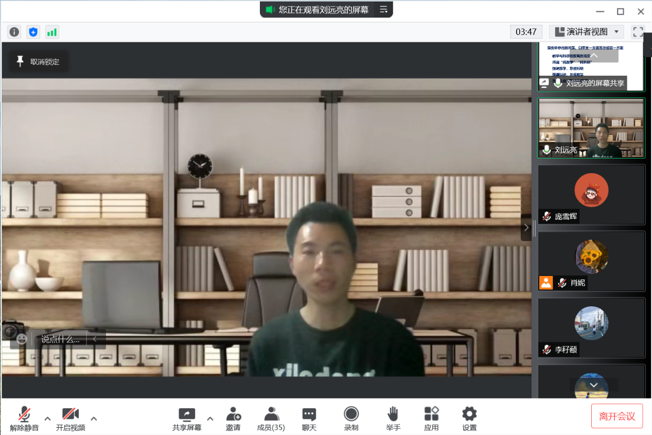 主办的朋辈思政课《青年教师经验谈》第4期正式开始,广大师生相聚云端,通过腾讯会议开展交流并共享经验。本期主讲人为学院青年教师刘远亮,91大神