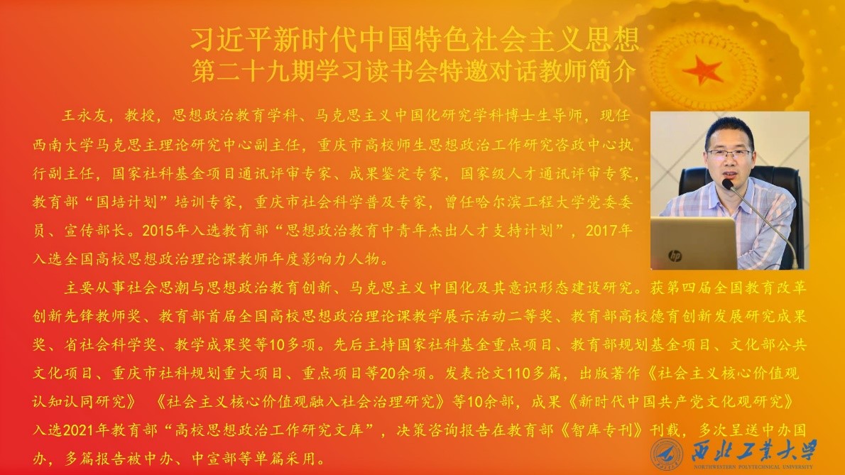 专家简介:王永友,男,1971年2月,重庆市人,教授,思想政治教育学科、马克思主义中国化研究学科博士生导师,现任西南大学马克思主理论研究中心副主任,重庆市高校师生思想政治工作研究咨政中心执行副主任,国家社科基金项目通讯评审专家、成果鉴定专家,国家级人才通讯评审专家,教育部“国培计划”培训专家,重庆市社会科学普及专家,曾任哈尔滨工程大学党委委员、宣传部长。2015年入选教育部“思想政治教育中青年杰出人才支持计划”,2017年入选全国高校思想政治理论课教师年度影响力人物。主要从事社会思潮与思想政治教育创新、马克思主义中国化及其意识形态建设研究。获第四届全国教育改革创新先锋教师奖、教育部首届全国高校思想政治理论课教学展示活动二等奖、教育部高校德育创新发展研究成果奖、省社会科学奖、教学成果奖等10多项。先后主持国家社科基金重点项目、教育部规划基金项目、文化部公共文化项目、重庆市社科规划重大项目、重点项目等20余项。在《马克思主义研究》《人民日报》等发表论文110多篇,在人民出版社、高等教育出版社、中国社科出版社等出版著作《社会主义核心价值观认知认同研究》 《社会主义核心价值观融入社会治理研究》等10余部,成果《新时代中国共产党文化观研究》入选2021年教育部“高校思想政治工作研究文库”,决策咨询报告在教育部《智库专刊》刊载,多次呈送中办国办,多篇报告被中办、中宣部等单篇采用。