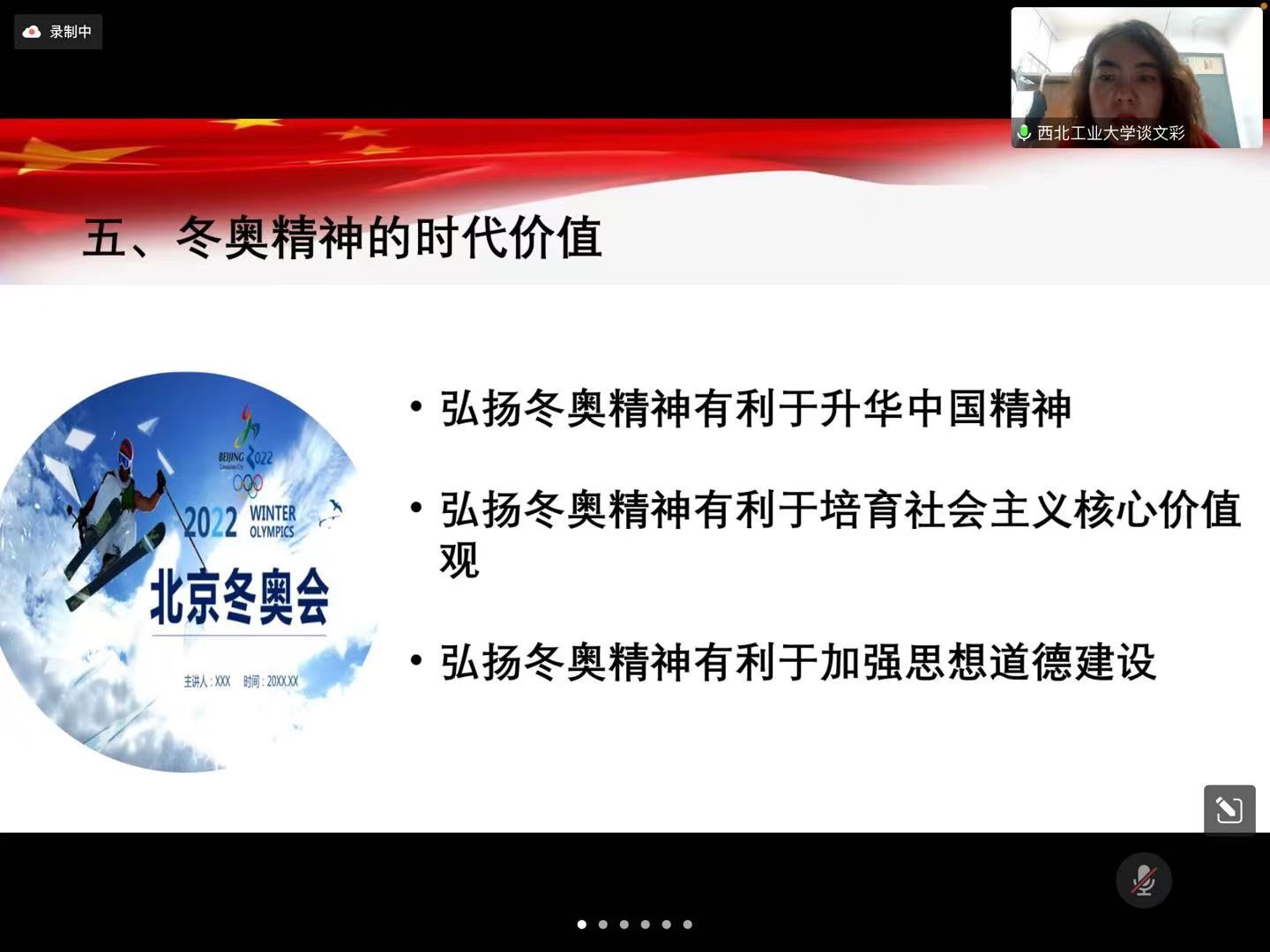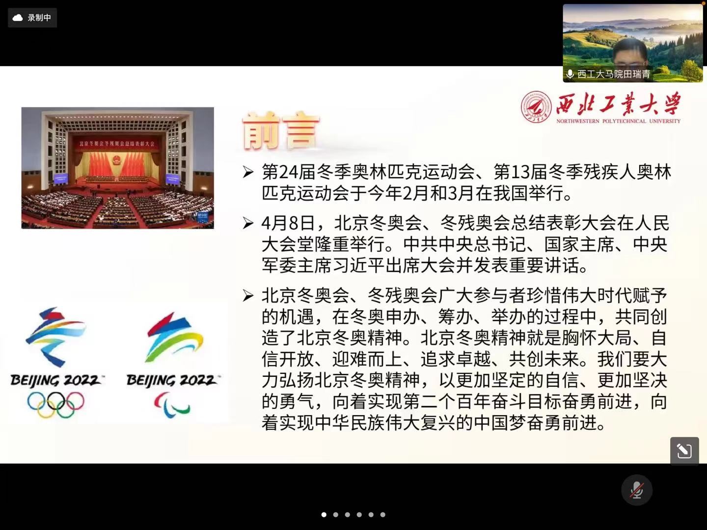 硕士生田瑞青同学。他从四个部分展开:第一部分,北京冬奥会、冬残奥会的举办历程。从奥运梦开始,历经申办、举办到圆满成功,2013年11月3日,中国奥委会正式致函国际奥委,提出申办2022年冬奥会、冬残奥会,到2022年2月4日晚,第二十四届冬季奥林匹克运动会开幕式在国家体育场举行。中共中央总书记、国家主席、中央军委主席习近平出席开幕式并宣布本届冬奥会开幕,历时九年,我国实现了成功举办冬奥会的目标。第二部分,《讲话》的内容解读。此次讲话的目的在于总结北京冬奥会、冬残奥会的经验;表彰突出贡献集体和突出贡献个人;弘扬北京冬奥会、冬残奥会筹办举办过程中培育的崇高精神;激励全党全国各族人民为实现第二个百年奋斗目标、实现中华民族伟大复兴的中国梦而努力奋斗!讲话的成果在于冬奥赛事精彩纷呈,国际社会积极评价;爱国情怀充分彰显,汇聚起实现中华民族伟大复兴的强大力量;“三亿人参与冰雪运动”成为现实,人民群众获得感显著增强等。讲话总结经验为坚持党的集中统一领导、坚持集中力量办大事、坚持主动防范应对各种风险挑战、坚持办赛和服务人民、促进发展相结合。让我们更加紧密地团结在党中央周围,发扬北京冬奥精神,以更加坚定的自信、更加坚决的勇气,向着实现第二个百年奋斗目标奋勇前进,向着实现中华民族伟大复兴的中国梦奋勇前进。第三部分,北京冬奥精神的阐释与研究。冬奥会形成的伟大的冬奥精神也将一直激烈国人奋勇向前。冬奥精神包括胸怀大局:心系祖国、志存高远;自信开放:雍容大度、开放包容;迎难而上:苦干实干、坚韧不拔;追求卓越:执着专注、一丝不苟;共创未来:协同联动、紧密携手。冬奥精神将引领铸就体育强国梦、中国梦;振奋民族精神,凝聚中国力量;展示建设成就,传扬和平主张;推进全民健身,增强人民体质。第四部分,问题与思考。这一部分用四个方面总结出学习讲话后的思考,一是用北京冬奥精神培育民族精神;二是体育盛会与中国梦;三是践行人类命运共同体理念;四是在思政课中用好北京冬奥精神。