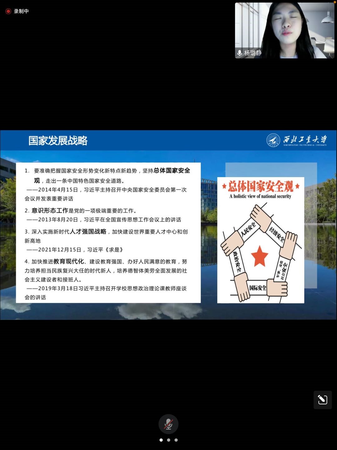 硕士生王晗熙同学。她从五个部分展开:第一部分,背景介绍。习近平总书记从2018年在北京大学考察到2019年出席纪念五四运动100周年大会并发表重要讲话到2020年向全国各族青年致以节日的祝贺和诚挚的问候再到2021年在清华大学考察,2022年在中国人民大学考察,相继在4年时间中进行广泛考察。第二部分,内容概要。此次出行分别考察了五大场所,一是立德楼观摩思政课智慧教室现场教学,习近平总书记强调,思想政治理论课能否在立德树人中发挥应有作用,关键看重视不重视、适应不适应、做得好不好;二是参观博物馆,习近平总书记强调,中国人民大学在抗日烽火中诞生,在党的关怀下发展壮大,具有光荣的革命传统和鲜明的红色基因。一定要把这一光荣传统和红色基因传承好,守好党的这块重要阵地;三是博物馆门前广场同老教授、老专家和中青年骨干教师代表亲切交谈,中青年教师向老教授老专家学习,立志成为大先生,在教书育人和科研创新上不断创造新业绩;四是参观图书馆,要精心保护好人民大学馆藏红色文献,逐步推进数字化,让更多的人受到教育、得到启迪;五是世纪馆北大厅同师生代表座谈并发表重要讲话,要建设世界一流大学、构建中国特色哲学社会科学、建设一支优秀教师队伍、培养堪当民族复兴重任的时代新人。第三部分,重点解读。围绕为谁培养人、怎样培养人、培养什么人三个问题展开重点解读。我国教育是为党育人、为国育才;通过大课程和大先生来培养;最终培养社会主义时代新人。第四部分,研究综述与展望。一是思政课教学实践研究;二是哲学社会科学体系建构研究。第五部分,问题与思考。在当前大、中、小学教学体系相对各自独立,教学目标具有一定差异,同时交流渠道有限、信息不对称的现实状况下,应当如何实现大中小学思政课教学的有效衔接?又应当以何种方式和标准检验和评价建设效果呢?