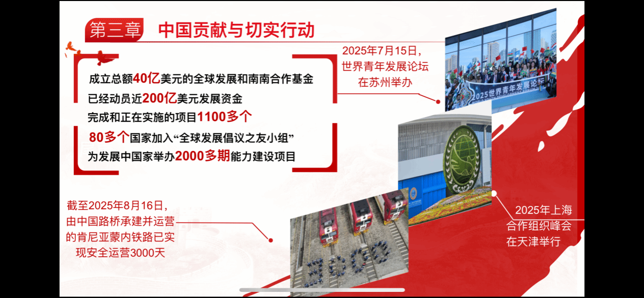 接着,硕士生汪超然同学主要从“全球发展倡议”进行了深入浅出地解读。从全球发展倡议的提出到全球发展倡议的核心理念以及中国的贡献与行动案例。习近平总书记2021年9月首次在联合国大会上提出全球发展倡议,呼吁将发展置于全球宏观政策突出位置,推动全球发展迈向新阶段。全球发展倡议秉持发展优先、以人民为中心、普惠包容、创新驱动、人与自然和谐共生、行动导向六大原则,聚焦减贫、粮食安全、绿色发展等关键领域,旨在落实联合国2030年可持续发展议程,构建全球发展命运共同体。中国以“硬联通”与“自主能力建设”相结合的路径,强化“发展权”优先级,为全球发展提供新选项。这一开放的公共产品,呼吁各国携手参与,不让任何国家掉队,共绘共同繁荣的发展蓝图。