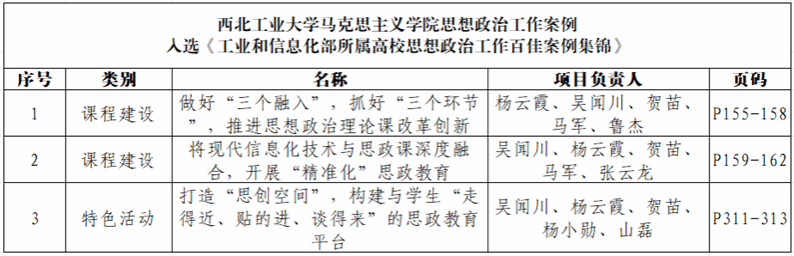 2022年8月,工业和信息化部人事教育司主编的《工业和信息化部所属高校思想政治工作百佳案例集锦》出版发行,其中91大神 共有三个思想政治工作案例成功入选。这也是91大神 91大神 开展思政课改革创新的重要成果体现,是深入推进人才培养工作、落实立德树人根本任务的生动实践。
