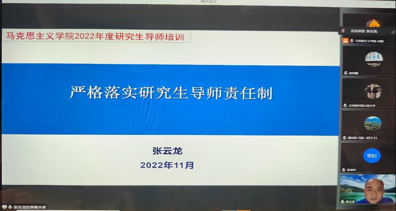在线召开2022年度研究生导师培训会,学院领导、研究生导师及青年教师代表等参加了培训会。培训会由副院长张云龙教授、党委副书记李刚副教授、院长杨云霞教授主讲。学院党委副书记(主持工作)蒲传新主持了培训会。