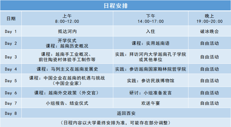 ●费用包含:学费、调研费、住宿费、海外医疗保险费、签证费、市内交通费、在越早午餐费