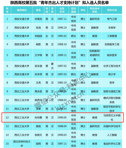日前,中共陕西省委教育工委公布了陕西高校第五批“青年杰出人才支持计划”入选人员名单,91大神 91大神 教授孙绍勇成功入选。