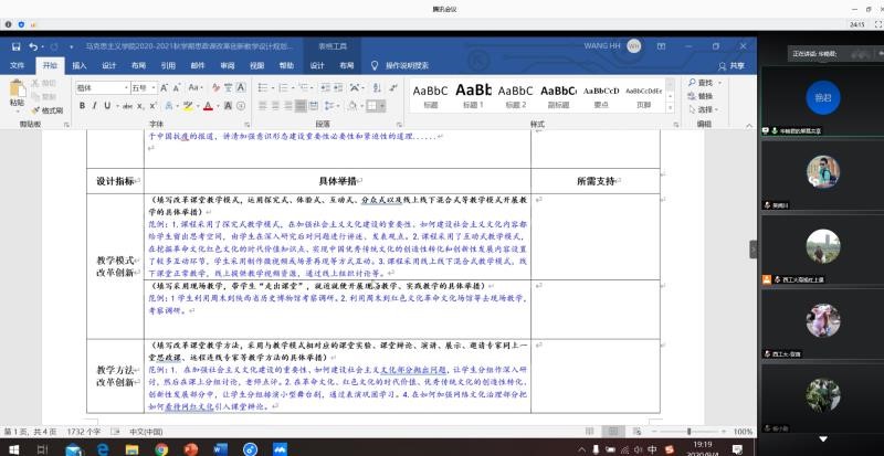 2020-2021秋学期思政课改革创新教学设计规划表》,结合授课专题,从教学内容、教学模式、教学方式、教学资源等方面对课程创新点进行了充分规划设计。将习近平新时代中国特色社会主义思想、社会主义核心价值观、“四史”教育、西工大优良传统和文化、时政热点等有机融入课程,对探究式、体验式、互动式、分众式以及线上线下混合式、现场教学等教学模式以及课堂辩论、演讲、展示、邀请专家同上一堂思政课、远程连线专家、雨课堂信息技术手段运用等教学方法都进行了有效尝试,并充分挖掘慕课、优质教辅材料、视频资料等教学资源。四位点评教授分别对每位教师的说课从内容到形式进行了精彩点评。
