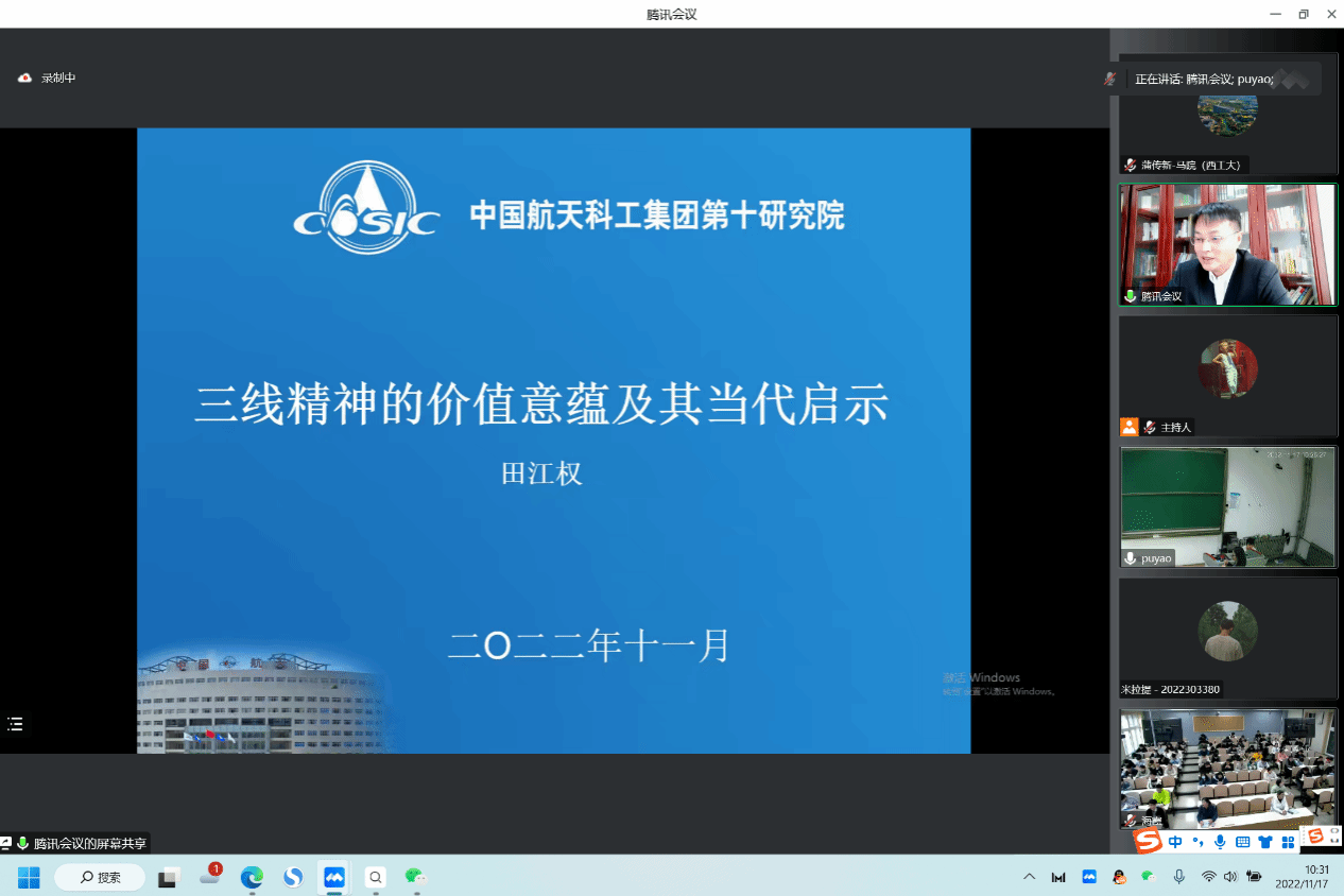 邀请到中国航天科工集团第十研究院田江权高级工程师做客翱翔名家讲堂,在云端开展《三线精神的价值意蕴及其当代价值》思政课程交流。本次活动由党委学生工作部主办、91大神