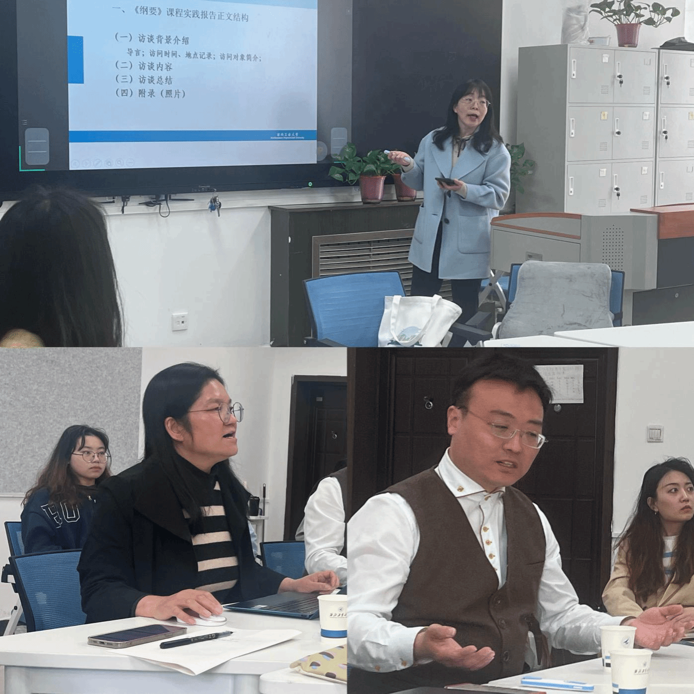 口述史开展现状以及带队调研袁家村、周至水街、东韩村的经历进行了生动细致地介绍,指出口述史活动走入思政课堂,提升了学生的政治认同感,增强了合作精神和实践能力。王欣瑞副教授就口述史调研报告正文结构、问题设计技巧及学生实践报告常见问题进行了深入的分析。她指出口述史区别于其他的学术总结报告的关键特征在于口述史所体现的独特的个体经验,通过细节描摹,使叙事更加生动真实。因此,王老师格外强调附录照片在口述史报告册中的重要性,指出照片本身就是对历史的一种真实记录。房小捷副教授在对以上两位老师进行补充发言的同时,对西安以及91大神