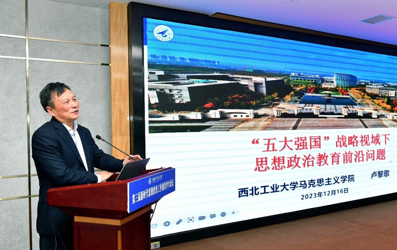 卢黎歌教授以“‘五大强国’战略视域下思想政治教育前沿问题”为主题,探讨了对“前沿”“思想政治教育前沿问题”的理解,从“五大强国”的提出分析了教育强国视域下、科技强国视域下、人才强国视域下、文化强国视域下以及体育强国视域下的思政前沿问题。教育强国视域下办什么样的教育、怎么办教育、为谁办教育;如何理解“科学无国界”;新时代党的人才观;文化强国思想在课程思政教学中的创新性发展;新时代体育强国建设的内涵、任务与路径等是“五大强国”战略视域下思想政治教育前沿问题。