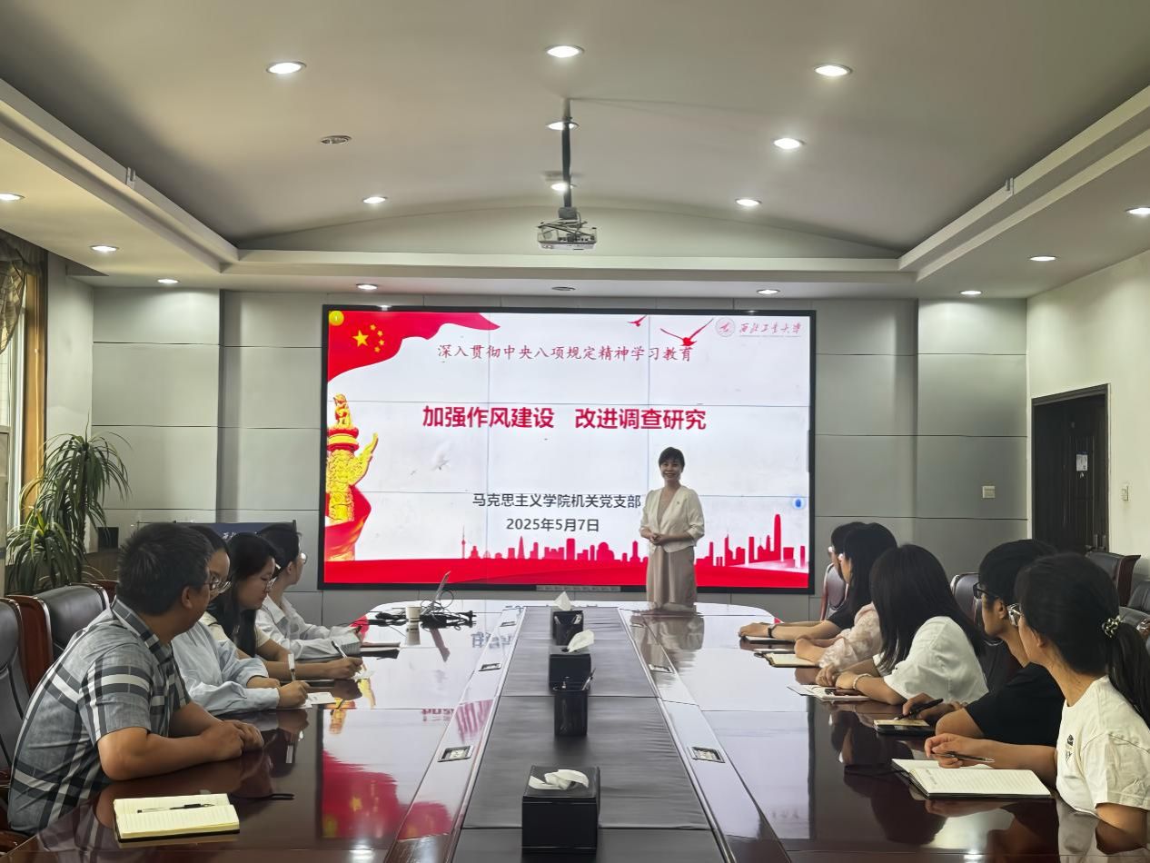副院长贺苗以《加强作风建设 改进调查研究》为题在学院楼208会议室,为学院机关党支部讲授深入贯彻中央八项规定精神学习教育专题党课。