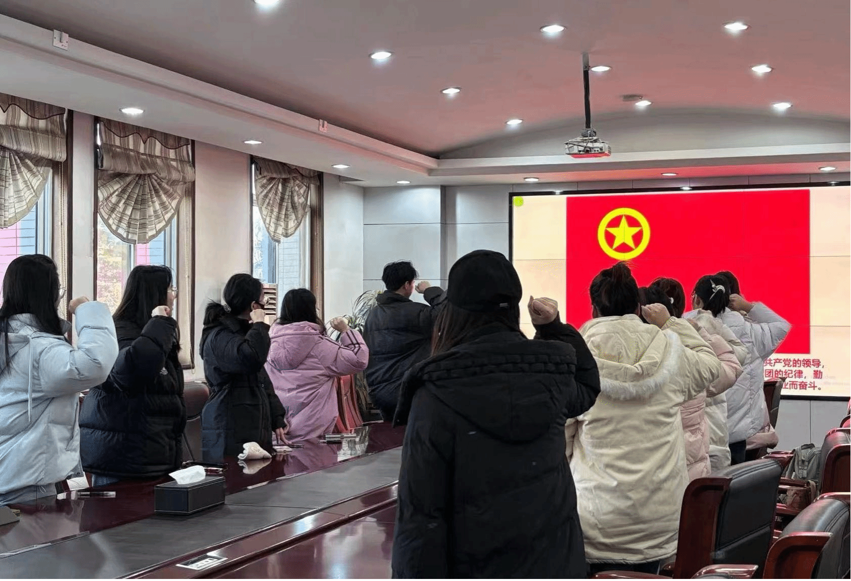 组织生活会最后一项,各团支部全体参会团员面对团旗,高举右拳,重温入团誓词。铿锵有力的誓词激励着团员青年们进一步坚定理想信念,树立历史使命感和社会责任感,不断砥砺奋进,做共产主义远大理想和中国特色社会主义共同理想的坚定信仰者和忠诚实践者,以不畏艰难、勇于担当的姿态迎接新时代的挑战。