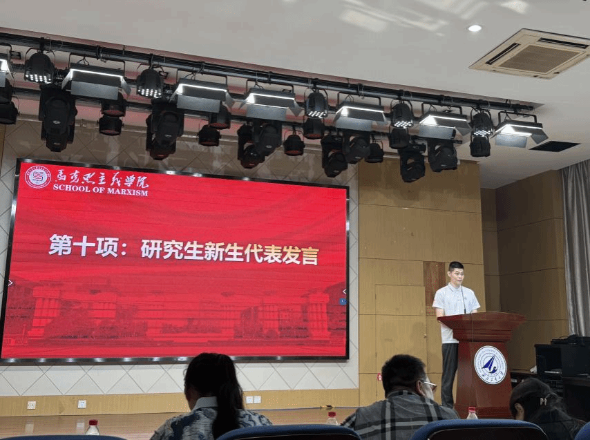 研究生新生代表马子杰同学以激昂的言辞表达了对未来的憧憬与决心。他呼吁大家要不断探索,潜心钻研,追求卓越;保持定力,坚韧不拔,肯坐冷板凳;勇于担当,热爱国家,将一腔热血投入到学术研究和报效国家之中。