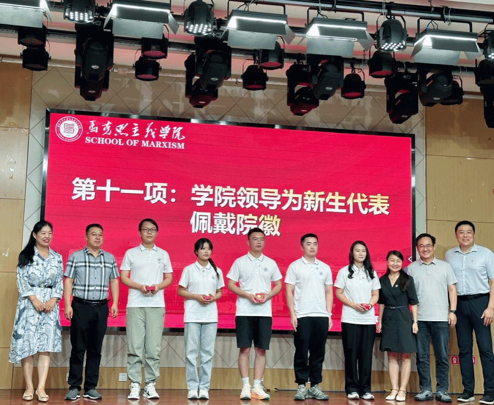 院徽是学院精神、文化、特色和理念的象征,佩戴上院徽意味着对学院精神的认同和归属,更意味着学院精神的传承与弘扬。学院领导为新生代表佩戴院徽,并与同学们合影握手致意,传递温暖与力量。