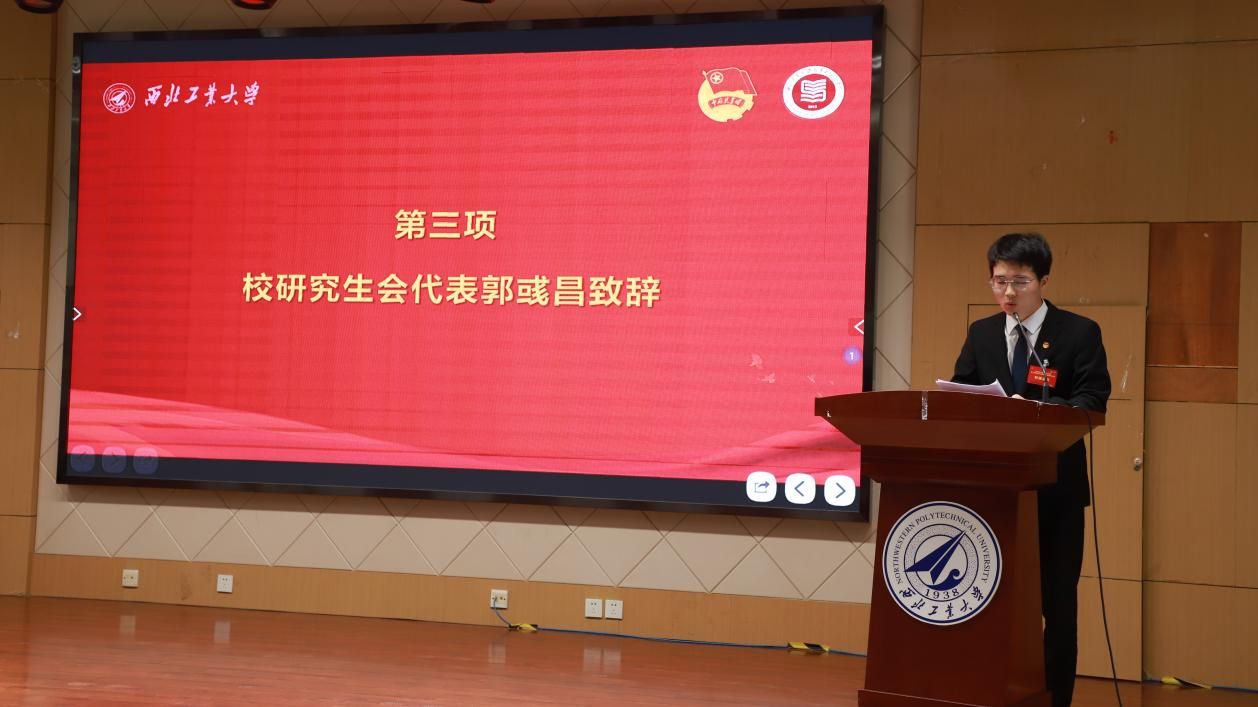 研究生会代表郭彧昌致辞。他代表校研究生会向学院全体研究生致以诚挚的问候,肯定了91大神