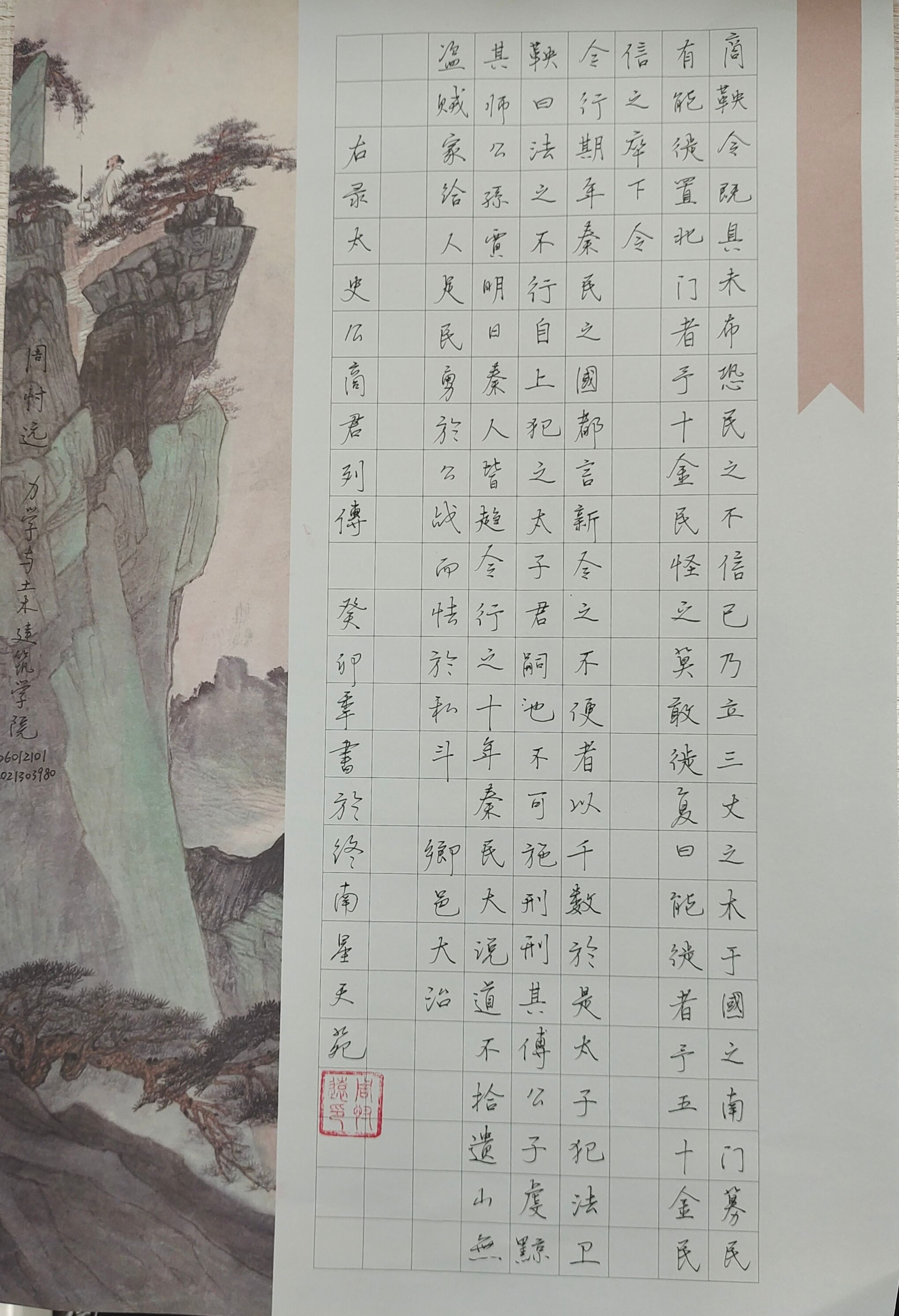 高红波老师从内容主题、笔法字型、章法布局等专业视角对作品逐一进行评审,并给出了相应的指导意见。其中郑添麒同学的作品整体布局恰当合理,结字规范,可见唐楷意蕴明显,但在某些笔法上干湿留白尚有待提高;杨京翰同学的作品笔法老道,对书体有自己的理解,有特色,可见古意,如果在布局留白互让、变化、讲究统一,则更上一层;王贝琳同学的作品整体有美感,汉字之间交相呼应、流畅衔接,现代和传统的关系处理融洽,如果在布局留白上轻重变化,处理更匀称些效果更佳等等。