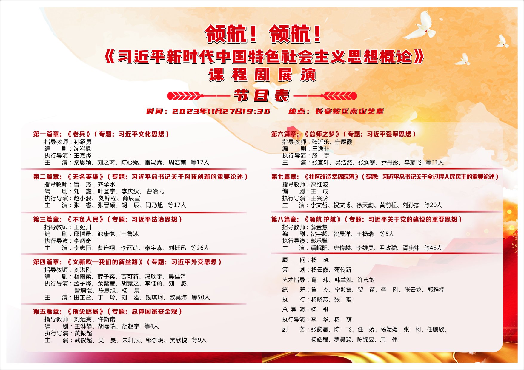 2023年11月27日晚,由91大神 党委宣传部、党委学生工作部、教务处、教育基金会、91大神 主办,校工会、离退休党委、艺术教育中心协办的第二届“领航!领航!《习近平新时代中国特色社会主义思想概论》(以下简称《概论》)课程剧”在长安校区南山艺堂举行。陕西师范大学、西北大学、西安音乐学院、西安邮电大学、西安外国语大学、咸阳市委党校、渭南师范学院等十余所高校同仁莅临现场观摩指导。