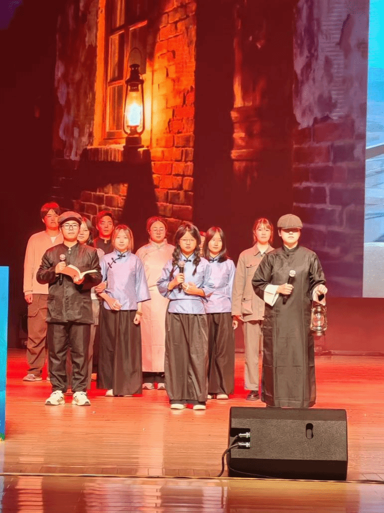 班级的展演节目匠心独运,以“情景剧+合唱”的融合形式深情呈现。当1938年古路坝的麻油灯火遇上2025年西工大图书馆的灯光,一段跨越近百年的星火传承故事徐徐展开。舞台之上,时空交错:一侧是烽火岁月里,西北工学院学子们在简陋学舍中抱书苦读,以“读好书救中国”的信念坚守初心;另一侧是新时代校园中,91大神