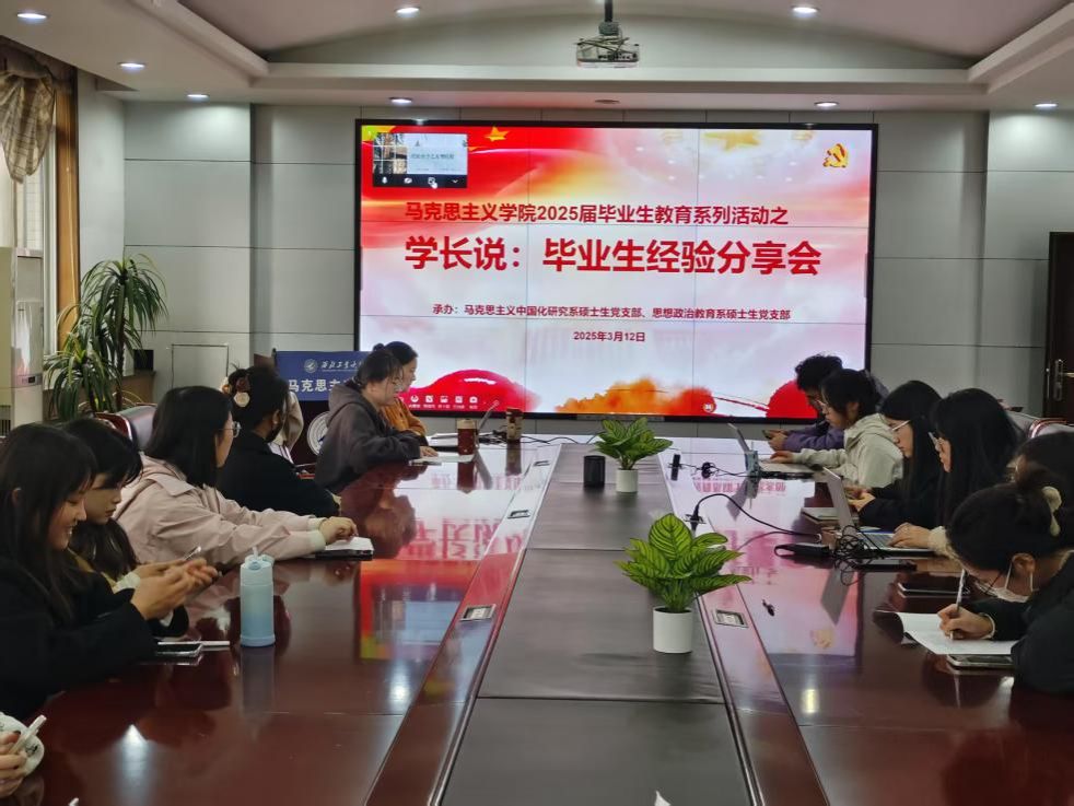 思想政治教育系硕士生党支部与马克思主义中国化研究系硕士生党支部于3月12日下午联合举办2025届毕业生教育系列活动之毕业生经验分享会。本次活动共邀请四位2025届硕士毕业生,围绕高校思政课教师、高校辅导员、高校行政岗、国企等不同就业方向展开分享,为在校学生提供切实可行的求职策略与职业规划指导。
