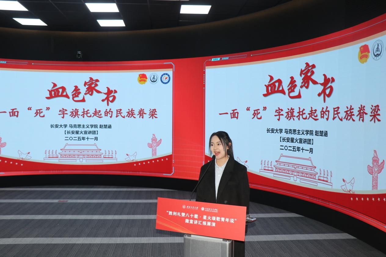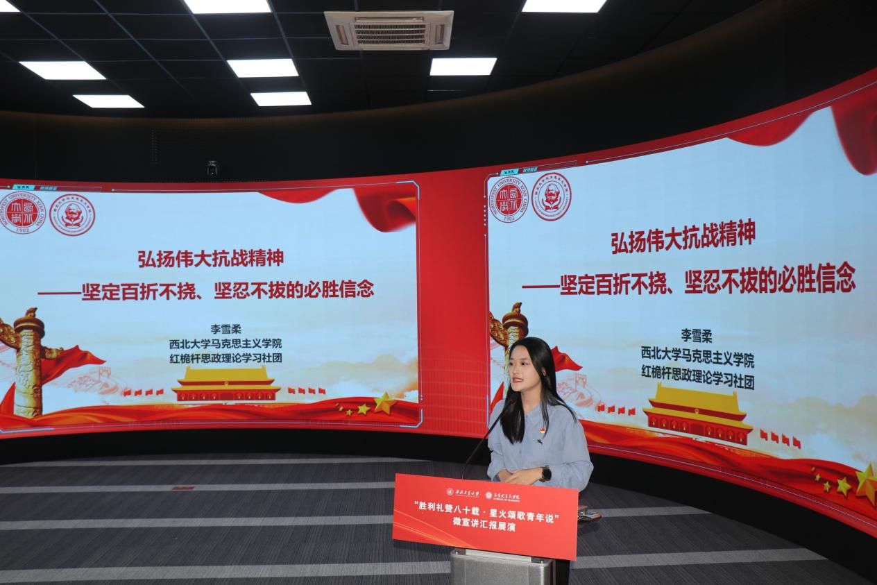 八校汇报展演分为上、下半场有序开展。18位选手紧扣抗战精神主题,或讲述烽火岁月里的红色家书故事,或解读延安精神的时代内涵,或追溯西安事变的历史意义,或聚焦东北抗联精神凝聚复兴力量的深刻阐释,诠释青年担当的深情表达。