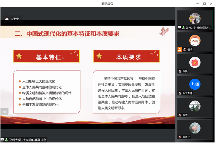 硕士生张昊同学。他从大会概况、内容概要、重点导读和问题思考四个部分展开。首先是第一部分,大会概况。2022年10月16日至10月22日,中国共产党第二十次全国代表大会在北京召开,习近平总书记代表第十九届中央委员会向党的二十大作的题为《高举中国特色社会主义伟大旗帜 为全面建设社会主义现代化国家而团结奋斗》的报告。第二部分,内容概要。从15个部分集中讲述了党的二十大报告的要点,认为报告擘画了全面建成社会主义现代化强国的宏伟蓝图和实践路径,就未来5年党和国家事业发展制定了大政方针、作出了全面部署。第三部分,重点导读。张昊同学重点讲解了“两个结合”、“中国式现代化”、“安全”三个关键词,指出“两个结合”很大程度上深化了我们党对坚持和发展马克思主义的规律性认识,也是我们理解和把握习近平新时代中国特色社会主义思想的关键。中国式现代化切合中国实际,体现了社会主义建设规律,把握了人类社会发展规律,同时具有鲜明的开放性、包容性和强大的感召力。党的二十大报告从统筹发展和安全的战略高度对国家安全做出新的部署,体现出国家安全在党和国家工作大局中的极端重要性。最后,张昊同学也向老师提出作为91大神