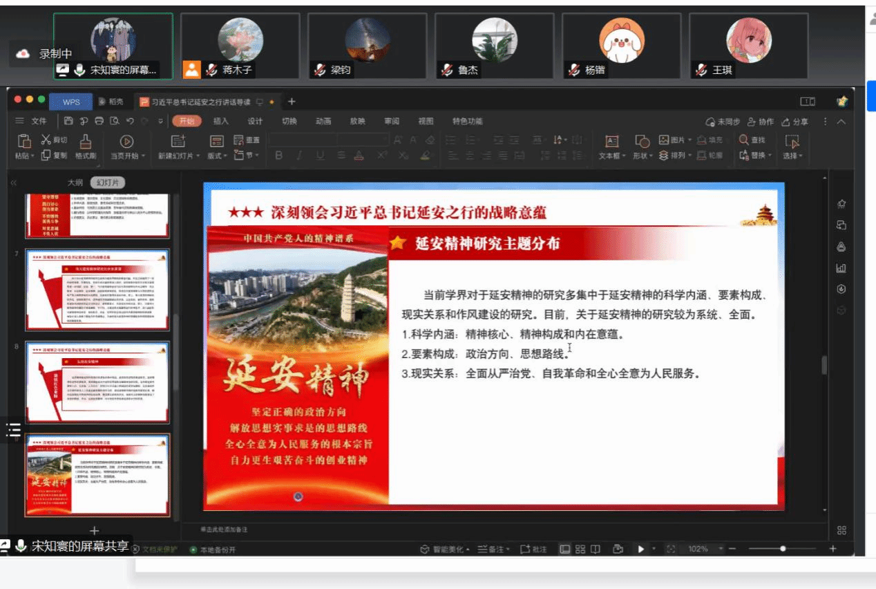 博士生宋知寰同学进行导读。他的主题是深刻领会习近平总书记延安之行的战略意蕴,内容共分为三个部分进行阐释。第一部分,宋知寰同学讲述了学习伟大建党精神,就要把握伟大建党精神内涵和根本逻辑,并根据学界现有的研究状况,围绕形成背景、生成逻辑、科学内涵、基本特征、价值地位、践行路径和价值意义等多个方面,对这一主题形成了较为全面的解释,最后提出研究视角和研究方法等方面有待进一步创新。第二部分指出要弘扬延安精神就要赓续红色血脉,延安精神是延安时期党的先进性的集中体现,是党的先进性的重要标志;同时对延安精神的科学内涵、要素构成、现实关系和作风建设的研究进行了总结,认为目前学界对于延安精神的论述较为全面、系统。但是基于时代背景的变化,有许多问题仍值得深入探讨。第三部分,具体阐释了要发扬斗争精神,就要提高斗争本领。斗争精神是与中国共产党相伴而生,并在革命、建设与改革的百年实践中不断演进而成的独特精神样态,它内蕴知重负重、苦干实干、攻坚克难的精神。但目前学界对于斗争精神的论述大多都集中于解读党的二十大报告和习近平总书记关于斗争精神的论述。