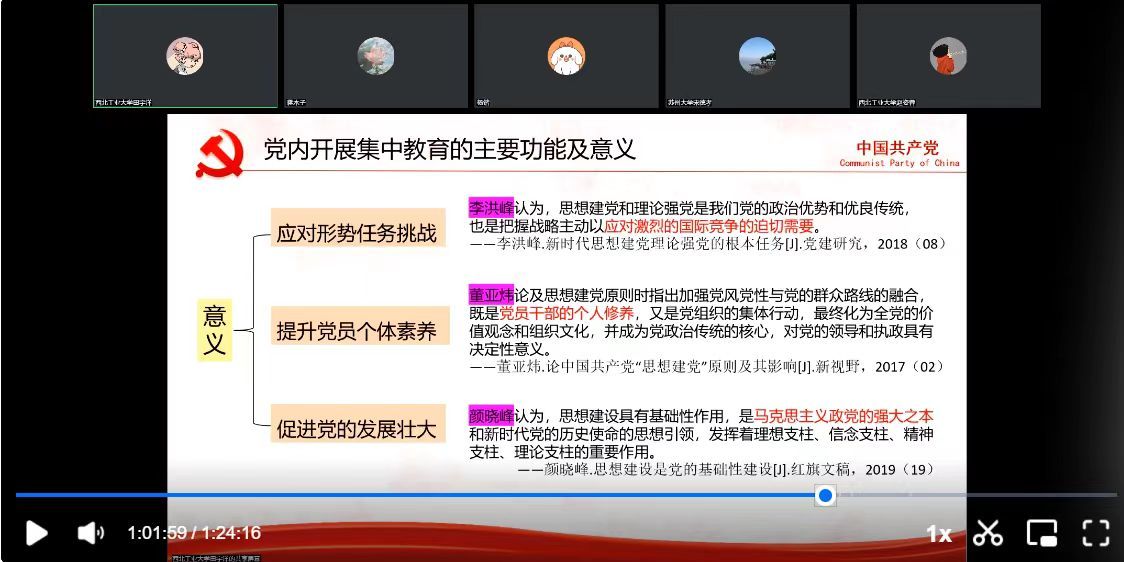 硕士生田宇洋同学进行导读。她首先通过总结专家学者的论述,介绍了习近平新时代中国特色社会主义思想的历史起点和逻辑起点,并阐述了国内国外的意义。第一部分是对这次讲话的重要意义进行解读,通过结合党的二十大报告,指出了这次讲话是统一全党思想意志行动、始终保持党的强大凝聚力、战斗力;是推动全党积极担当作为、不断开创事业发展新局面;是深入推进全面从严治党、以党的自我革命引领社会革命的必然要求。第二部分是全面准确把握主题教育的目标要求进行了自己的阐释。第三部分从明确领导责任;强化督促指导;注重统筹兼顾;加强宣传引导四个部分来论述如何切实加强对主题教育的领导。最后一部分对学习贯彻习近平新时代中国特色社会主义思想的目的进行总结,即对全党而言要提高运用党的创新理论的能力,对领导干部而言要坚持以身作则、以上率下。