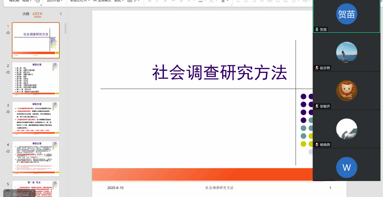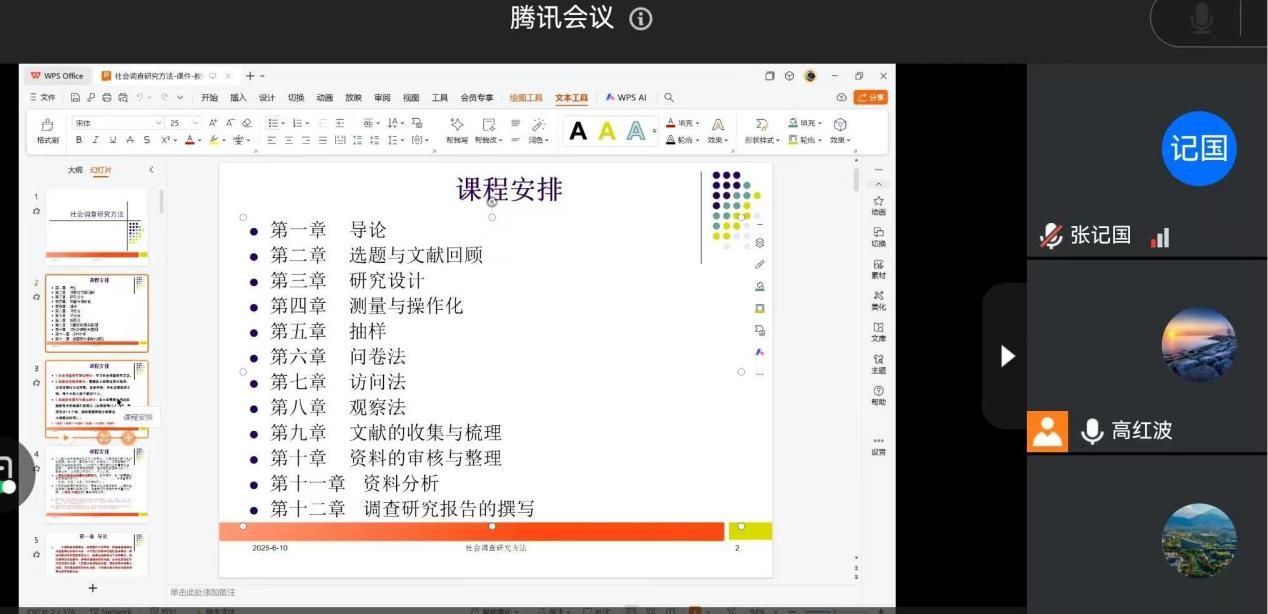高红波根据学院前期相关安排部署情况,简要说明了思政实践课关于社会调查研究方法教学的重要性,并结合思政实践课理论教学要求,提出社会调查研究方法课程的教学内容设计与具体课时安排。同时说明了通过各方共同努力,综合参考多种社会研究方法教材和著作,调研总结部分高校社会研究方法课程经验,课程组顺利完成思政实践课社会调查研究方法课件主体内容设计。高红波详细介绍了全篇各个章节的基本情况和部分章节的重点教学内容与注意事项,并提出为了进一步完善课件内容,课程组全体老师可点对点地提出有针对性的修改意见和建议。