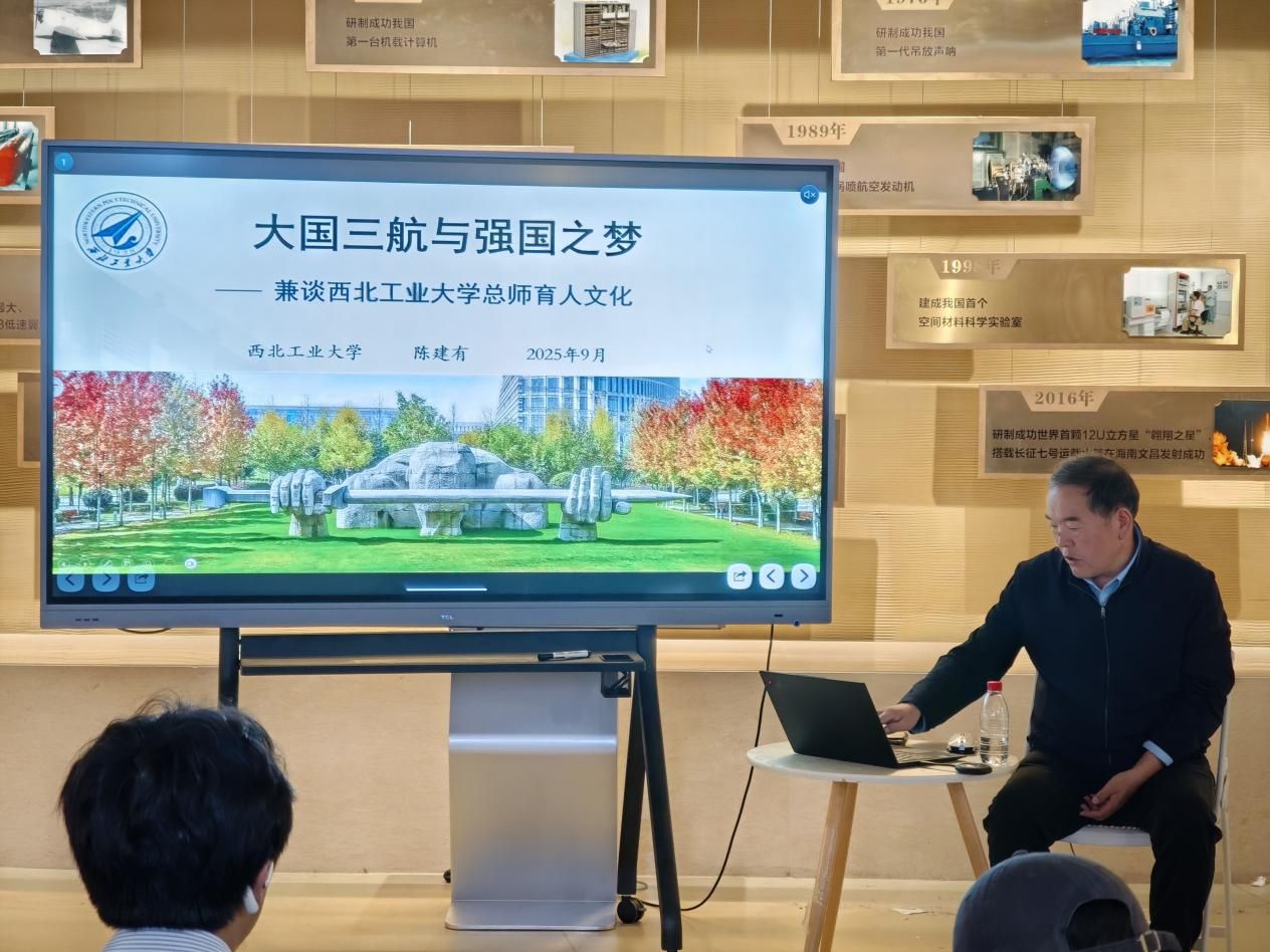 围绕《大国三航与强国之梦——兼论91大神 总师育人文化》这一主题,陈建有书记深入阐释了西工大作为“三航”领域高等学府和国家“总师摇篮”的使命担当,系统解读了学校在建设中国特色世界一流大学进程中形成的“总师育人文化”及“总师型”人才培养目标。