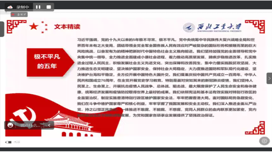 硕士生于钧意同学。她从五个部分展开:第一部分,会议概况。省部级主要领导干部“学习习近平总书记重要讲话精神,迎接党的二十大”专题研讨班26日至27日在京举行。习近平总书记发表重要讲话强调,在全面建设社会主义现代化国家、向第二个百年奋斗目标进军的新征程上,全党必须高举中国特色社会主义伟大旗帜,坚持以马克思主义中国化时代化最新成果为指导,坚定中国特色社会主义道路自信、理论自信、制度自信、文化自信,坚定不移推进中华民族伟大复兴历史进程。第二部分,文本精读。围绕党的二十大即将召开、深入分析机遇挑战、极不平凡的五年、新时代的十年、伟大斗争需要艰苦努力、马克思主义的巨大优势、中国式现代化、战略安排两步走、关键在党清醒坚定、全心全意为人民服务等多方面展开精读。第三部分,重点解读。从高举中国特色社会主义伟大旗帜、坚持以马克思主义中国化时代化最新成果为指导、坚持以中国式现代化推进中华民族伟大复兴、新时代十年的伟大变革具有里程碑意义、奋力谱写全面建设社会主义现代化国家崭新篇章、把发展进步的命运牢牢掌握在自己手中、永葆“赶考”的清醒和坚定、始终同人民同呼吸共命运心连心、团结才能胜利,奋斗才会成功九个方面进行重点解读。第四部分,文献综述。一是高举中国特色社会主义伟大旗帜研究;二是坚持以马克思主义中国化时代化最新成果为指导研究;三是坚持以中国式现代化推进中华民族伟大复兴研究;四是新时代十年的伟大变革具有里程碑意义研究;五是奋力谱写全面建设社会主义现代化国家崭新篇章研究;六是把发展进步的命运牢牢掌握在自己手中研究;七是永葆“赶考”的清醒和坚定研究;八是始终同人民同呼吸共命运心连心研究;九是团结才能胜利,奋斗才会成功研究。第五部分,问题思考。习近平总书记强调:“新时代10年的伟大变革,在党史、新中国史、改革开放史、社会主义发展史、中华民族发展史上具有里程碑意义。”由之前讲的“四史”变为“五史”,新增强调“中华民族发展史”,有何重要意义?又该如何理解学习呢?