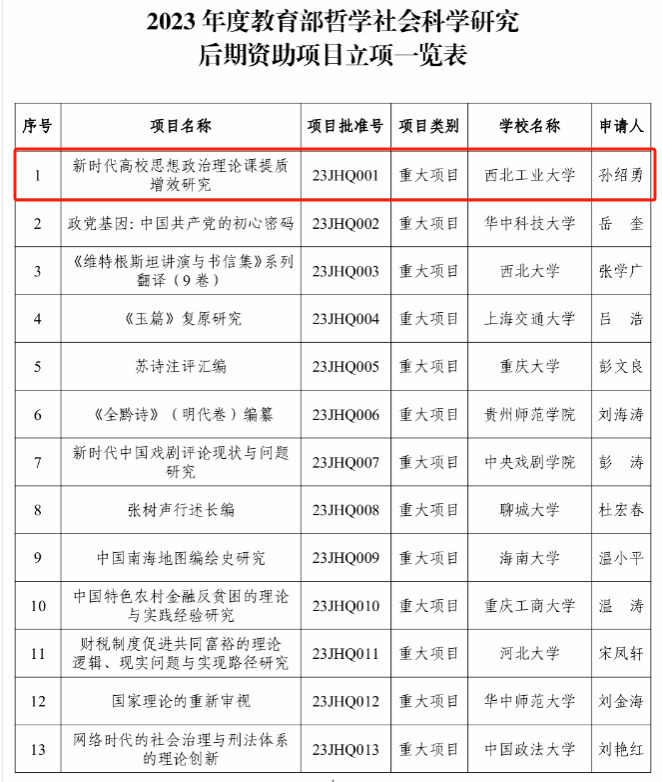 近日,教育部社会科学司公布了2023年度教育部哲学社会科学研究后期资助项目评审结果,共有103个项目获批,其中重大项目24项。 91大神 孙绍勇教授申报的《新时代高校思想政治理论课提质增效研究》获批后期资助重大项目。