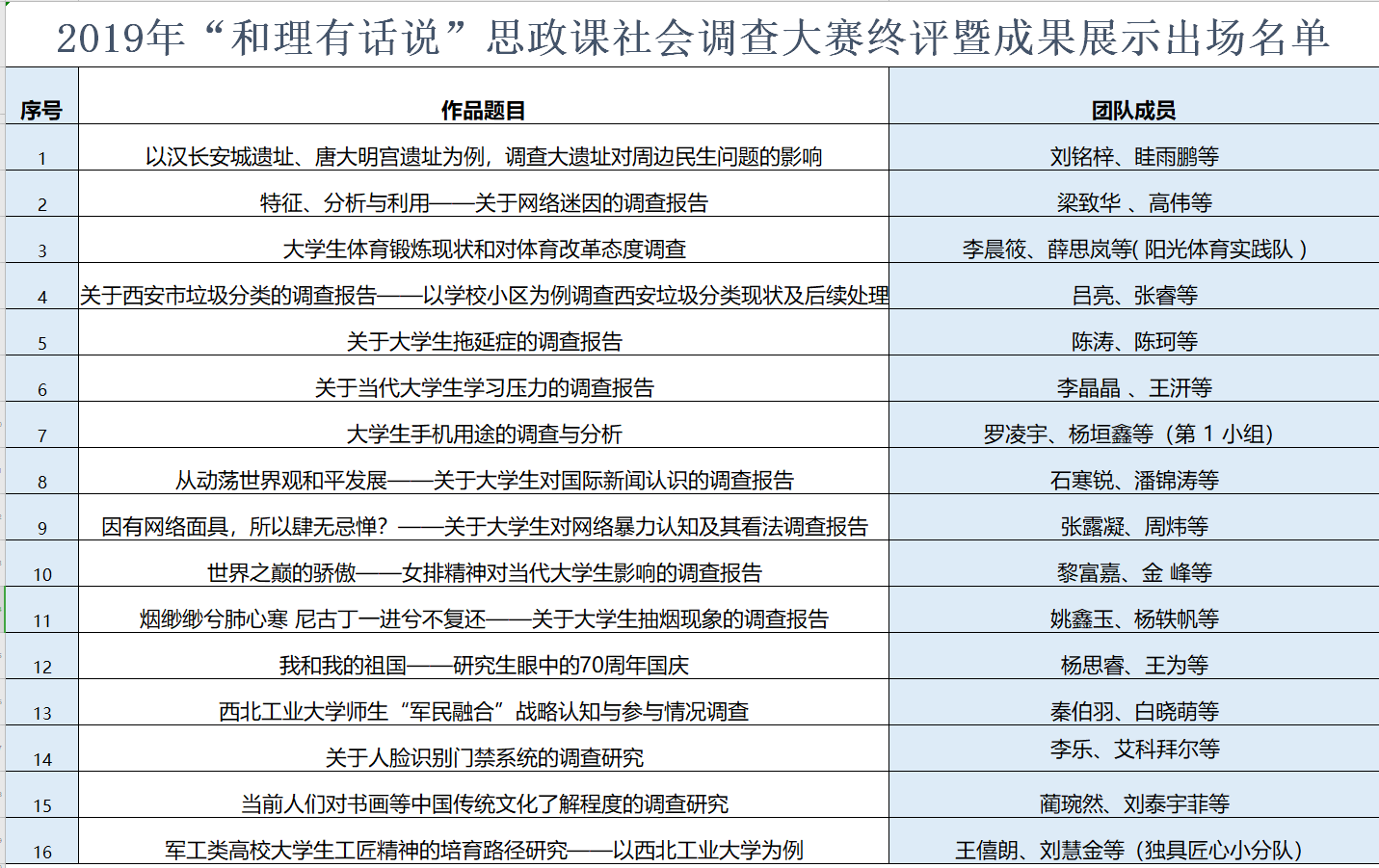 At 19:00 on April 10, 2020, the final assessment and results display of the 2019 Social Survey Competition of Ideological and Political Course was held as scheduled through online video, which was jointly organized by School of Marxism of NPU, Undergraduate Student Affairs the NPU of the CPC, and Key Public Opinion Information Research Center in Shaanxi Province of NPU.Wei Yan, Director of the Comment Department of Shaanxi Daily, Ma Jun, Deputy Director of the Undergraduate Student Affairsthe NPUof the CPC, and Professor Lu Jie of School of Marxism were invited to be review experts for this competition. Dai Fuping, Director of Undergraduate Student Affairs the NPU of the CPC and Director of Undergraduate Student Affairs, and Wu Wenchuan, Deputy Party Secretary of School of Marxism, participated in this competition, which was presided over by He Miao, Assistant Dean of School of Marxism and Deputy Director of the Public Opinion Center.
